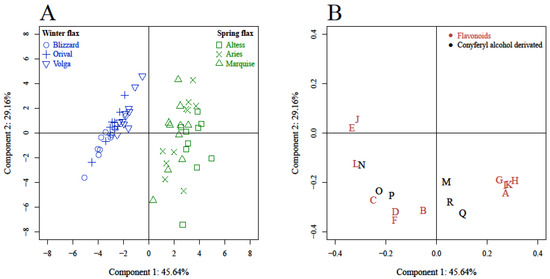 Principal component analysis (PCA) of flax leaves metabolites content with score plot (A) and loading plot (B). A: Isovitexin, B: Vitexin, C: Schaftoside, D: Vicenin-1, E: Swertisin, F: Vicenin-2, G: Isoorientin, H: Orientin, I: Carlinoside, J: Swertiajaponin, K: Lucenin-2, L: Triticuside A, M: Coniferin, N: 3-Hydroxy-2-[4-[(1E)-3-hydroxy-1-propen-1-yl]-2-methoxyphenoxy]propyl β-d-glucoside (HHMPG), O: Dehydrodiconiferyl alcohol-4-O-glucoside (DCG), P: Lariciresinol-4-O-glucoside (LMG), Q: Pinoresinol-4-O-glucoside (PMG), R: Pinoresinol diglucoside (PDG).