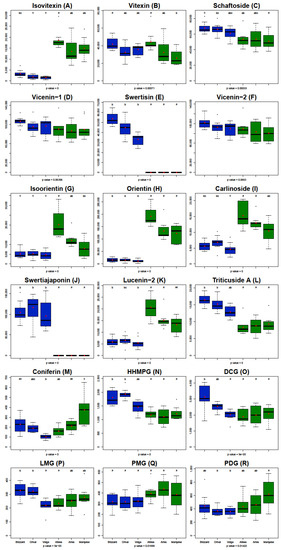 Univariate analyses were performed using a Kruskal and Wallis test (p < 0.05) to monitor the relative differences in the content of each metabolite when comparing the winter and spring flax varieties (Figure 4). The main differences between the winter and spring flax varieties were obtained for the contents of swertisin and swertiajaponin. While the relative areas of these two compounds were among the highest in winter flax varieties, they were not detected (even as a trace) in spring flax varieties. In contrast, the contents of isovitexin (four to 12 times) and isoorientin, lucenin-2 and carlinoside (1.5 to four times) were significantly higher in spring flax varieties. Slight differences were detected for HHMPG, triticuside A and schaftoside. The contents of these three compounds in spring flax varieties were about 1.2 to two times lower than those in winter flax varieties.