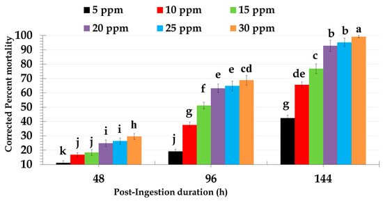 Percent corrected mortality of Rhynchophorus ferrugineus larvae fed on artificial diet incorporated with different doses of novaluron. Bar charts reveal means and SE calculated from five replicates. Different lower-case letter(s) above the bars indicate significant differences in the corrected percent mortality calculated at different time intervals upon feeding with different doses of novaluron. The comparison of mortalities from different treatments (doses) at different time intervals was performed by Repeated Measures ANOVA. Significant differences among the means were analyzed by Fisher’s LSD test, α = 0.05.
