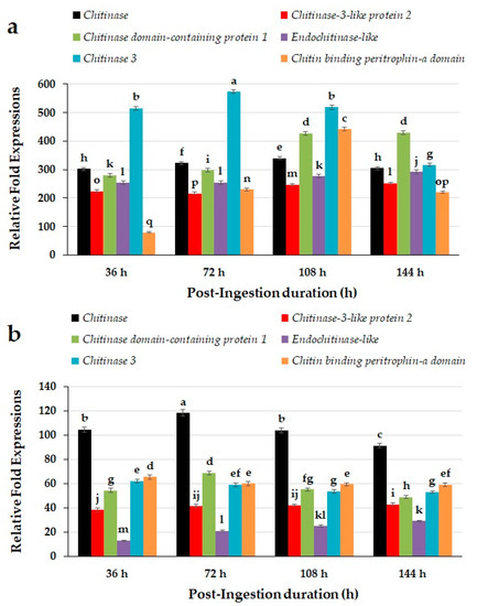 The expressions of chitin degradation related genes including chitinase, chitinase-3-like protein 2, chitinase domain-containing protein 1, Endochitinase-like, chitinase 3, and chitin binding peritrophin-a domain determined in the mid-gut of red palm weevil larvae upon ingestion with novaluron revealed time-dependent expression patterns (Figure 2a). The toxicity of novaluron revealed significant differences in the expressions of chitin degradation related genes (F = 1597.70; df = 5, 80; p < 0.0001), recorded at different time intervals (F = 54.59; df = 3, 80; p < 0.0001), and their interaction (F = 96.04; df = 15, 80; p < 0.0001). Among all the studied genes, chitinase 3 greatly upregulated at 36, 72, and 108 h post-ingestion and remained statistically at the highest level. The chitin binding peritrophin-a domain was found to be the least expressed after 36 h of ingestion. Although, chitinase domain-containing protein 1 and chitin binding peritrophin-a domain had huge difference between their expression levels, both showed similar pattern in their gene expressions. Similarly, chitinase-3-like protein 2 and Endochitinase-like also exhibited similar patterns of expression over time. On the other hand, chitinase remained statistically at same level except 72 and 108 h time interval, which showed slight upregulation compared with 36 and 144 h time intervals as shown in Figure 2a.