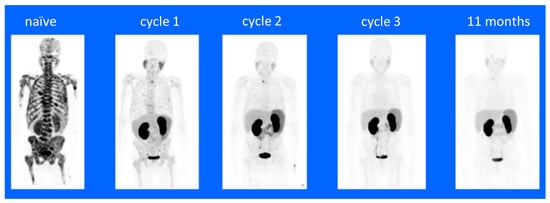68Ga-PSMA-11 PET/CT images of a treatment-naïve patient with extensive bone metastasis at primary diagnosis. A complete remission was observed after three cycles of 225Ac-PSMA-617 with de-escalating activities of 8/7/6 MBq. The patient remained symptom-free with undetectable serum PSA and a negative 68Ga-PSMA-11 PET/CT at 11-month follow-up evaluation. This figure and legend were reproduced from Sathekge, et al. [6].