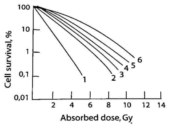 Survival of a human kidney T-cell culture irradiated with ionizing particles of different kinds: (1) particles with E = 2.5 MeV, LET = 165 keV/m; (2) particles with E = 27 MeV, LET = 25 keV/m; (3) deuterons with E = 3.0 MeV, LET = 20 keV/m; (4) X-rays with E = 20 keV and LET = 6 keV/m; (5) X-rays with E = 250 keV and LET = 2.5 keV/m; and (6) particles with E = 2.2 MeV, LET = 0.3 keV/m. This figure and legend were reproduced from [21].