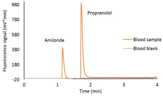 Chromatography was performed using a 0.01% formic acid solution as the aqueous mobile phase (A) and acetonitrile as the organic modifier (B) at a flow rate of 0.55 mL/min. The total run time was 6 min with an elution gradient as follows: 0–0.5 min, 1% B; 0.5–3 min, linear change from 1% to 95% B; 3–3.5 min, 95% B; 3.5–3.6 min, from 95% to 1% B; 3.6–6 min, 1% B. During the chromatographic analysis, the column was thermostated at 35 °C and samples were kept at 10 °C in the autosampler. The excitation/emission wavelengths of the FLD detector were 363/415 nm for amiloride and 287/340 nm for propranolol.