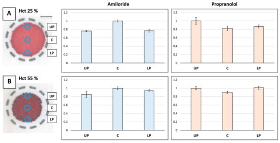 The response obtained for each analyte after the analysis of the three different positions for low Hct (25%) and high Hct (55%) can be observed in Figure 3. Results were normalized to the more intense response in order to facilitate data interpretation. A clear difference in the analytes’ distribution behavior was noticed when comparing the response of the samples obtained in the center and in the periphery. In order to easily indicate the distribution shape of drugs, de Vries et al. [] defined the central/peripheral (C/P) ratio value as the division of the response obtained in the central zone (C) by the one obtained in the peripheral zone (P). In this way, it is possible to show if the drug is more concentrated in the center (C/P > 1), in the periphery (C/P < 1), or if it is homogeneous (C/P ~ 1). In our study, after calculating the average of the two peripheral areas, the C/P values for amiloride were 1.31 and 1.12 for the 25% and 55% Hct samples, respectively. For propranolol, the C/P ratios were 0.88 and 0.89.