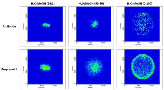 Different distribution of amiloride and propranol observed by MALDI-IMS after a 20-µL drop of different combinations of H2O:MeOH was placed in the cellulose support.