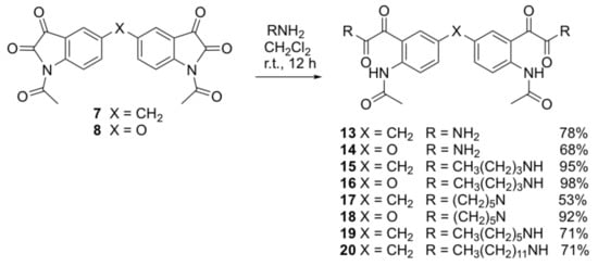 The ring-opening reactions of bis-N-acetylisatins 8 using primary amines with longer alkyl chains, such as hexylamine and dodecylamine were also investigated, but these reactions did not proceed at room temperature. However, by heating the reaction mixtures at reflux overnight the bis-glyoxylamide products 19 and 20 were obtained as yellow solids in moderate yields.