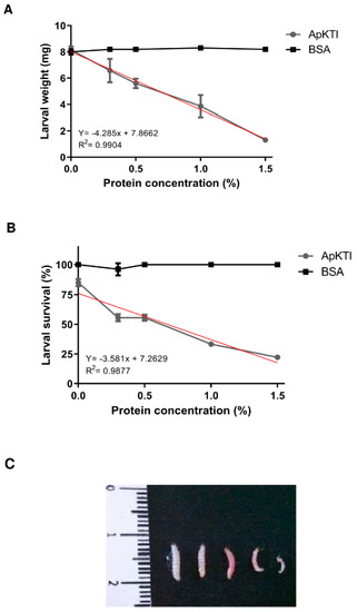 Bioassays with P. interpunctella larvae. Artificial diet was enriched with ApKTI from 0.3% to 1.5% (w/w). At the final of bioassays (15 days) the weight (A) and survival (B) in each treatment were determined. In control treatment the artificial diet was supplemented with bovine serum albumin (BSA) at the same concentration of ApKTI. A linear regression was obtained from ApKTI-fed larvae demonstrating the dose-response effect. (C) Representative image of larvae of each treatment, in sequential order from the left: control-fed larvae, larvae fed with 0.3%, 0.5%, 1.0%, and 1.5% ApKTI.
