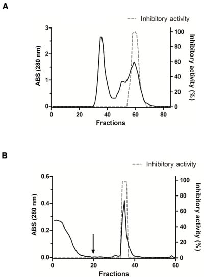 Initially, a precipitation with ammonium sulfate was used to fractionate the crude extract into fractions. Afterwards, the inhibitory activity against trypsin was determined to each fraction. We observed that the fraction 40%–60% from ammonium sulfate precipitation showed the highest inhibitory activity against trypsin. This fraction was chosen to further purification of ApKTI. First, the fraction 40%–60% was applied into gel filtration chromatography, resulting in two peaks: (i) A first peak corresponding to high molecular mass proteins and; (ii) a second peak containing a mix of intermediate and low molecular mass proteins. The fractions collected at the final portion of the second peak revealed trypsin inhibitory activity (Figure 2A). These active fractions were pooled and applied onto an affinity trypsin-Sepharose column (Figure 2B). The chromatogram of trypsin-Sepharose column showed proteins eliminated during the washing step with no affinity by column. The elution of fractions adsorbed to column, started from fraction 20, resulted in elution of a single peak. This peak showed inhibitory activity against trypsin and, therefore, was named ApKTI (Figure 2B).