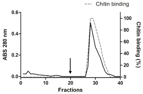Binding of ApKTI in chitin column chromatography was used to demonstrate the affinity. The dotted line represents the binding of ApKTI in chitin column.