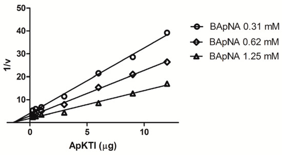 Binding mode between ApKTI and trypsin. Kinetic studies were carried out using different concentration of inhibitor and substrate. Following the Michaelis–Menten parameters determination, the Dixon plot was obtained. The points where lines intersect the X-axis converge to a common point, while different 1/V were observed, determining a non-competitive inhibition mechanism between ApKTI and trypsin.