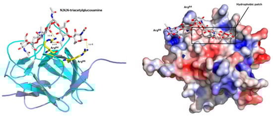 Tri-N-acetylglucosamine in complex with ApKTI, where Arg64 and Arg66 located at the reactive site loop from ApKTI are involved in the complex stabilization (left). Adaptive Poisson–Boltzmann solver (APBS) electrostatic potential of ApKTI (potential ranges from −5 kT/e (red) to + 5 kT/e (blue)), highlighting the Arg64 and Arg66 residues and the hydrophobic pocket involved in GlcNAc attachment (right).