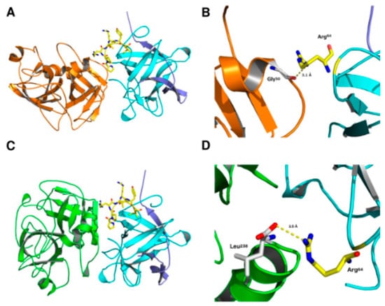Tridimensional theoretical models for ApKTI, trypsin and chymotrypsin from P. interpunctella. β-strand scaffold showed two main cores formed by antiparallel β-strands, as well as α-helix and loop arrangements are observed in both enzymes. Predicted conformations for the (A) ApTI/trypsin and (C) ApTI/chymotrypsin complexes (yellow sticks represent the reactive site loop of ApTI). Atomic interactions involving Arg64 located at the reactive site loop from ApKTI are highlighted in the (B) ApKTI/trypsin and (D) ApTI/chymotrypsin complexes. Trypsin and chymotrypsin active sites are highlighted as white sticks.