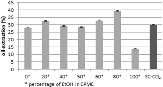 Oil extraction yields (g for 100 g of dry matter) using different volume percentages of ethanol in cyclopentyl methyl ether (CPME), compared to the yield obtained by SC-CO2. p < 0.05.