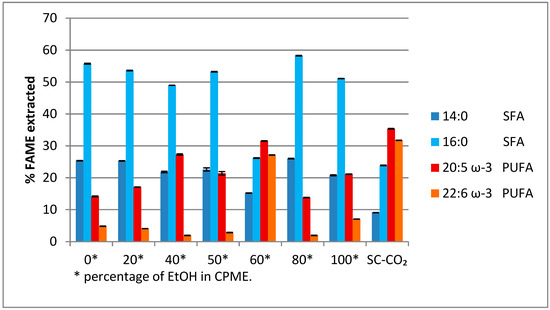 From the GC-MS analysis, it was found that the most abundant fatty acid methyl esters (FAMEs) present in the various extracts were those of myristic and palmitic acid (two saturated fatty acids), and EPA and DHA (two ω-3 polyunsaturated fatty acids) derivatives. These were considered to evaluate the performance of the EtOH/CPME mixture compared to SC-CO2 in the extraction process (Figure 2).
