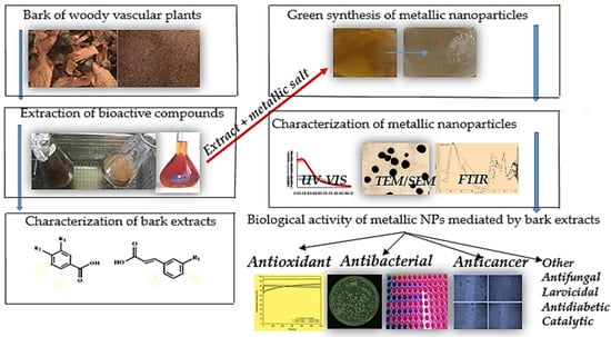 The aim of this review is to summarize the literature data (2012–2019) on metallic nanoparticles mediated by plant bark extracts, the nanoparticles’ characteristics, and to discuss their properties, including anticancer, antimicrobial, antioxidant, and other activities. The literature data used in this paper was collected via PubMed and Google Academic (2012–2019). The search terms were: metallic nanoparticles, bark extract, woody vascular plants, phytoconstituents, reducing agents, antioxidants, antimicrobial, and anticancer.