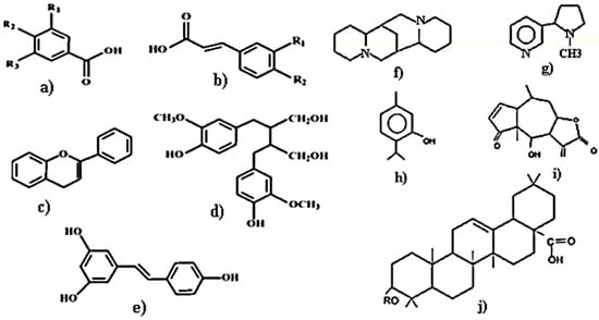 General structures of bioactive compounds identified in the bark extracts: (a) benzoic phenolic acids; (b) cinnamic phenolic acids; (c) flavonoids; (d) lignans; (e) stilbenes; (f,g) alkaloids; (h) monoterpenes; (i) sesquiterpenes; (j) triterpenes and saponins.