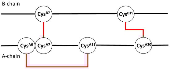 Insulin is a small protein containing two separate chains (A- and B-chain), connected by two interchain disulfide bonds (CysA7–CysB7 and CysA20–CysB19) [58]. A third, intrachain disulfide bond connects CysA6 and CysA11 [58]. The disulfide bonds of insulin are shown in the cartoon in Figure 1.