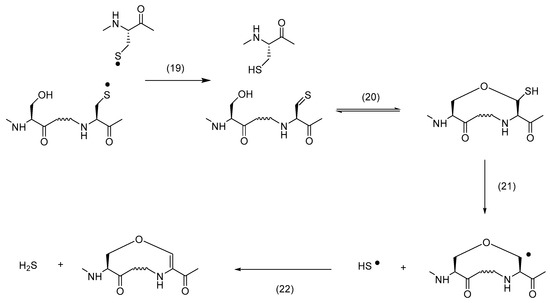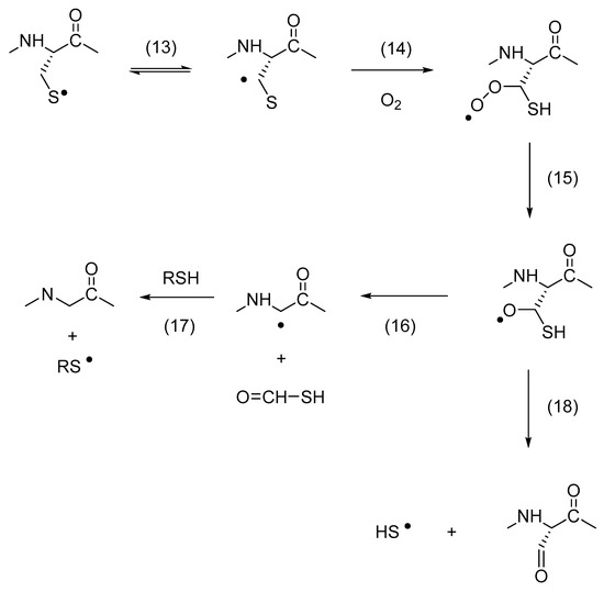Thiyl radicals can engage in a great variety of reactions including hydrogen atom transfer (HAT), electron transfer (ET), and addition/elimination reactions. In this way, they can react with literally all of the 20 essential amino acids, though rate constants, e.g., for HAT reactions, may vary with amino acid structure [19]. Important information about the potential reactions of thiyl radicals in proteins can be gleaned from enzymatic processes, rendering at least some thiyl radical-mediated degradation pathways of pharmaceutical proteins “biomimetic” [20].