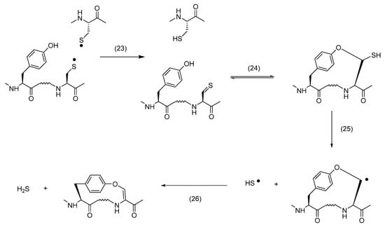 When hGH was exposed to UV light, mass spectrometry analysis revealed the formation of vinyl ether between the original Cys189 and Ser184 residues and between the original Cys160 or Cys165 and Tyr164 residues [84]. The proposed mechanisms for the formation of these products are displayed in Scheme 4 and Scheme 5, respectively. Key to product formation is the homolytic cleavage of a disulfide bond into a pair of CysS•, followed by disproportionation into thiol and thioaldehyde. The latter can react with the hydroxyl group of either Ser or Tyr to yield a thiohemiacetal. Under continuous UV exposure, the C–S bond of the thiohemiacetal is expected to cleave, either homolytically or heterolytically [92,93,94], and the vinyl ether is generated via subsequent oxidation and deprotonation, respectively [95]. An important difference between the results of both growth hormones is the formation of an ether cross-link in mGH vs. a vinylether cross-link in hGH. This may be rationalized by sequence differences between hGH and mGH [96], as we also observed significant differences in photooxidation between hGH and rat growth hormone (rGH) [97]. We believe that the ether cross-link is ultimately generated via reduction of a vinyl ether. The UV exposure of disulfide-containing peptides leads to the formation of Cys [95,98] and H2S [95]. Under UV-exposure, the specifically thiolate forms of Cys and H2S, i.e., CysS− and HS−, release an electron, which can reduce Dha. The latter was experimentally tested during the photo-irradiation of a disulfide-containing model peptide in the absence and presence of methylene chloride (CH2Cl2), a prominent scavenger of hydrated electrons [99]. Hence, we propose that vinyl ether reduction by a hydrated electron, followed by a HAT—likely from a photochemically generated thiol [95,98]—is key to the generation of an ether cross-link. We observed an analogous mechanism for the formation of a thioether cross-link from vinyl thioether, where CH2Cl2 inhibited thioether formation during UV-exposure [95]. Interestingly, the UV exposure of hGH also led to both vinyl thioether and thioether cross-links between the original Cys182 and Cys189 residues [84], i.e., Cys residues which originally form the disulfide bond characterizing the small C-terminal loop of hGH.