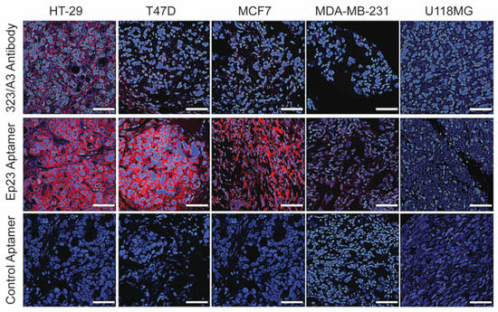 Sensitivity of antibodies and aptamers to EpCAM in different cell lines. Immunofluorescence staining of colon cancer (HT-29), breast cancer (T47D, MCF7, and MDA-MB-231), and glioblastoma (U118MG) xenograft tumors by EpCAM antibody, 323/A3, and EpCAM aptamer, Ep23, and control aptamer (blue: nuclei; red: EpCAM positive staining). Aptamer staining was performed for 15 min at 37 Β°C, while 323/A3 staining was performed at 4 Β°C overnight. The antibody is unable to distinguish between moderate and low expression of EpCAM whereas the aptamer staining intensity is relative to EpCAM expression. All fluorescent images were taken under a confocal microscope with 60Γ magnification. Images are representative of at least three separate experiments. Scale bar: 50 mm.
