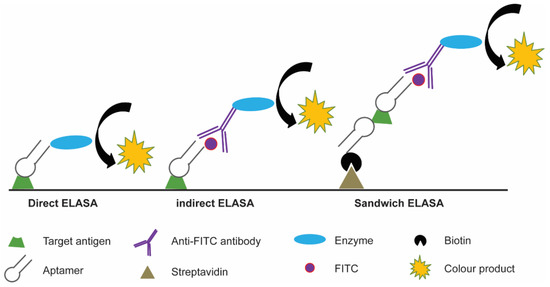 Schematic of enzyme-linked aptamer sorbent assay (ELASA). In direct ELASA, the aptamer can be conjugated to an enzyme or other reporter molecule directly; in an indirect ELASA, the aptamer is first labelled with a reporter molecule, such as FITC, to which a secondary antibody-enzyme conjugate binds; in the sandwich ELASA, a biotinylated aptamer is bound to a surface to capture the target antigen, and the same aptamer-reporter molecule and secondary antibody pairing are used to provide a colourimetric change.