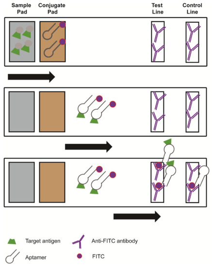 Schematic of a lateral flow device. A sample containing the target is added to the bottom of the test strip and, through capillary force, moves through the conjugate pad, where aptamer-reporter molecules attach to the target, to be captured by the antibodies in the test and control line.
