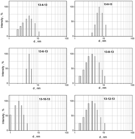 - Pisárčik, M.; Devínsky, F.; Lacko, I. Aggregation number of alkanediyl-α, ω-bis (dimethylalkylammonium bromide) surfactants determined by static light scattering. Colloids Surf. A Physicochem. Eng. Asp. 2000, 172, 139–144. [Google Scholar] [CrossRef]