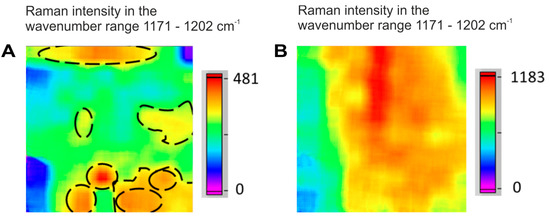 Raman hyperspectral images of acetylsalicylic acid particles in two different tablet regions. (A) Area with clear and distinct particle shapes and sizes (source: tablet T, Region 4). (B) Area with agglomerated particles (source: tablet N, Region 3).