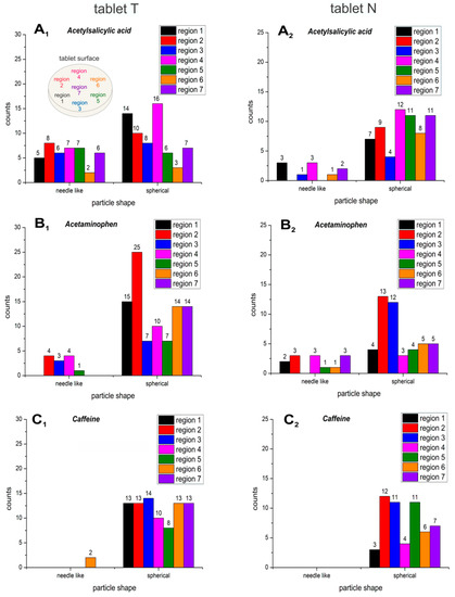 Histograms of the counted needle-like (left parts in the graphs) and spherical (right parts in the graphs) particle shapes of the active ingredients acetylsalicylic acid (A1, A2), acetaminophen (B1, B2) and caffeine (C1, C2), which were detected across seven different regions (see the sampling pattern at A1) in the two commercial tablets T (left column: A1, B1, C1) and N (right column: A2, B2, C2).