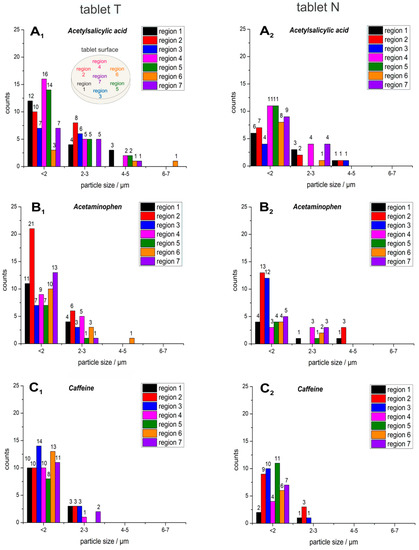 Histograms of the detected particle sizes of the active ingredients acetylsalicylic acid (A1, A2), acetaminophen (B1, B2) and caffeine (C1, C2), which were detected across seven different regions (see the sampling pattern at A1) in the commercial tablets T (left column: A1, B1, C1) and N (right column: A2, B2, C2).