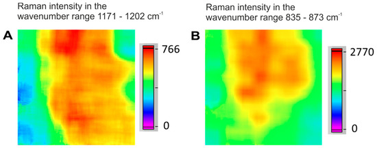 Raman hyperspectral images of agglomerated particles of (A) acetylsalicylic acid (source: tablet T, region 1) and (B) acetaminophen (source: tablet N, region 1) in two different tablet regions.