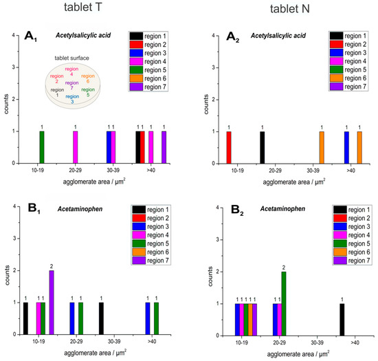 Histograms of the detected agglomerations of the API particles and their respective area sizes of acetylsalicylic acid (A1, A2), acetaminophen (B1, B2), which were detected across seven different regions (see the sampling pattern at A1) in the two tablets T (left column: A1, B1) and N (right column: A2, B2).