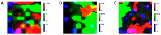 Combined distribution of acetylsalicylic acid, acetaminophen and caffeine in three different areas (A, B, C) of one tablet. The red-colored parts represent acetylsalicylic acid, the green-colored parts represent acetaminophen, and the blue-colored parts represent caffeine. The dark-grey areas are the excipients’ areas.
