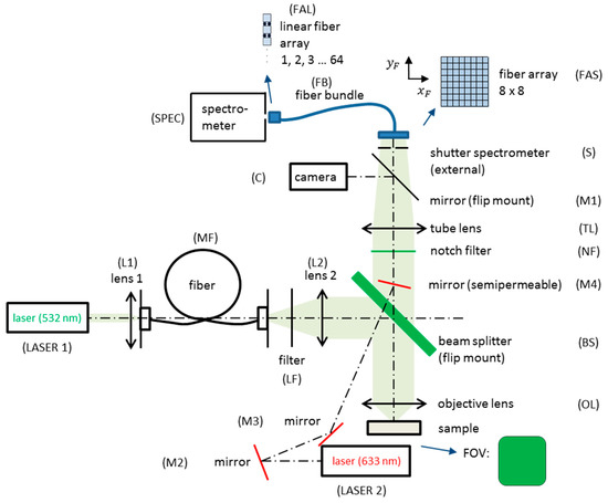 The experimental setup is the following (Figure 8): a laser with a wavelength of 532 nm (LASER1) is coupled by a lens (L1) into a step-index-multimode fiber (MF) with a squared core cross section to illuminate the sample homogeneously with a top hat intensity profile. The light from the fiber output passes through a lens (L2) and is reflected into an objective lens (OL) by a dichroitic beam splitter (BS). The objective lens focuses the light onto a square-shaped field of view (FOV) on the sample. It is used in combination with a tube lens. The FOV depends on the ratio of the focal lengths of lens 2 (L2) and the objective lens (OL). Within the scope of this study for a high spatial resolution, the most suitable magnification was 100×, resulting in a FOV area of 10 × 10 µm2 in the sample plane. The back-scattered light is collected by the objective lens (OL) with an NA of 0.9, defining the collection depth of about 1.6 µm with a 532 nm excitation wavelength. A notch filter (NF) reflects the laser excitation and Rayleigh-scattered light. Having passed the beam splitter (BS) and the tube lens (TL), the light can be directed by a flip mirror (M1) to a camera (C) to observe a microscopic image and choose an appropriate sample region. For the Raman spectroscopic measurements, the chosen sample region is imaged onto the entrance face of a fiber-array (FAS) with an 8 × 8-configuration. Sixty-four spectra can be collected simultaneously. The spatial resolution is 1.25 µm per image point. To realize a high fill factor, the cores of the fibers are square-shaped. The spectral information captured by the 8 × 8-fiber-array is transferred by a fiber bundle to the spectrometer (IsoPlane, Princeton Instruments) and the fibers are arranged in a line (FAL) in the plane of the entrance slit. A second laser with a wavelength of 633 nm (LASER 2) in combination with three mirrors (M2, M3, M4) are included in the setup. The 633 nm laser generates a spot with a diameter around 3 µm on the sample; it is used to identify the chosen sample area and for adjusting the fiber-array.