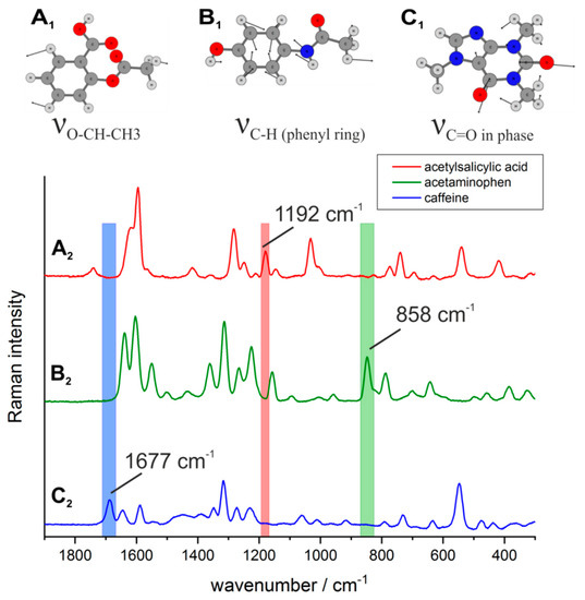 Characteristic vibrational modes and assignments of the active ingredients acetylsalicylic acid (A1, A2), acetaminophen (B1, B2) and caffeine (C1, C2).