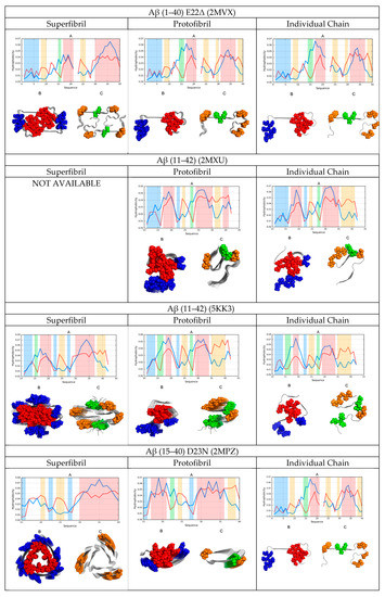 - Roterman, I.; Dułak, D.; Gadzała, M.; Banach, M.; Konieczny, L. Structural analysis of the Aβ (11–42) amyloid fibril based on hydrophobicity distribution. J. Comput.-Aided Mol. Des. 2019, 33, 665–675. [Google Scholar] [CrossRef] [PubMed]