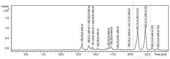 UHPLC/ESI-MS chromatograms of octasaccharide dalteparin fraction isolated by SEC. Two major U8,11,0-aM.ol isomers of interest are shown in the rectangular frame. Monoisotopic m/z values for prevalent ion forms: U8,10,0–aM.ol, m/z 845.135 ([M − 3H + 3DBA]3−); U8,9,1–aM.ol, m/z 875.537 ([M − 3H + 4DBA]3−); A7,10,0–aM.ol, m/z 786.458 ([M − 3H + 3DBA]3−); U8,10,0,Rc–aM.ol, m/z 883.182 ([M − 3H + 4DBA]3−); A7,11,0–aM.ol, m/z 856.160 ([M − 3H + 4DBA]3−); U8,10,1–aM.ol, m/z 902.189 ([M − 3H + 4DBA]3−); U8,11,0–aM.ol, m/z 914.838 ([M − 3H + 4DBA]3−).The abbreviation system includes, in order, the number of monosaccharide residues, sulfate groups, and N-acetyl groups. Symbols U and A were added to indicate a saturated uronic acid and a glucosamine unit, respectively, at the NRE, while aM.ol and Rc indicate 2,5-anhydro-mannitol at the RE and ring-contracted residues [12,35], respectively.