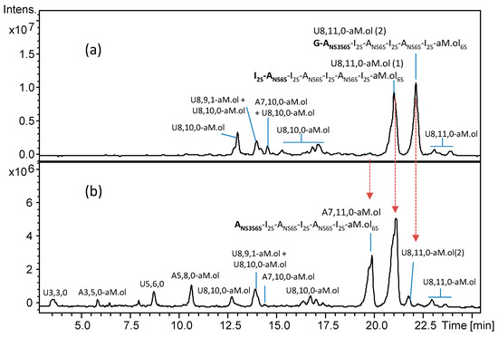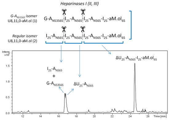 Together with the prevalent U8,11,0–aM.ol isomers, their minor isomers eluted between 22.5 and 24 min are believed to bear G–ANS3S6S moiety within their chains accordingly to Bisio et al.: I2S–ANS6S–G–ANS3S6S–I2S–ANS6S–I2S–aM.ol6S and I2S–ANS6S–I2S–ANS6S–G–ANS3S6S–I2S–aM.ol6S [12]. Heparanase only partially hydrolyzed these isomers, however, the appearance of tri- and pentasaccharide pairs (U3,3,0/A5,8,0–aM.ol and U5,6,0/A3,5,0–aM.ol, respectively, Figure 3) is in accordance with the proposed structures (Figure 3).