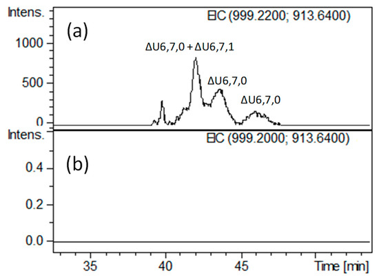 Notably, we found other minor tetrasaccharides attributed to ΔU4,4,0 and an additional isomer of ΔU4,4,1 (eluted between 33.5 and 35 min) as well as ΔU4,5,1 (eluted at about 37.5 min), whose generation and structure have not been reported previously. More unexpectedly, very lowly abundant hexasaccharides with m/z 913.6 (z = −2) and m/z 999.2 (z = −2), attributed to ΔU6,7,0 (unsaturated hexasaccharide with seven sulfate groups) and ΔU6,7,1 (unsaturated hexasaccharide with seven sulfate groups and one acetyl group), respectively, were detected (Figure 5a and Figure S3). The presence of three positional isomers of ΔU6,7,0 was exclusively observed in HA bovine heparin, while only a heparinase-resistant ΔU6,6,1 hexamer has been previously found in HA porcine heparin fraction [7]. These findings are both in agreement with higher abundance of N-acetylated ATBR variant in porcine heparin.