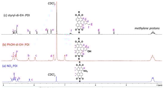 ΝΜR spectra of the expanded region 4.0–9.0 ppm of (a) NO2-di-EH-PDI, (b) PhOH-di-EH-PDI, and (c) styryl-di-EH-PDI in CDCl3.