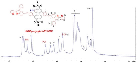 The final molecule named diQPy-styryl-di-EH-PDI afforded in yields up to 60% after recrystallization from toluene. Through 1H and 13C NMR characterization (Figures S8 and S15, respectively) the successful synthesis was confirmed. In Figure 2, expanded aromatic region of the 1H NMR spectrum of the diQPy-styryl-di-EH-PDI is presented where all the characteristic peaks of the aromatic protons of quinoline-pyridine and PDI could be assigned confirming the successful synthesis.