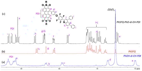 1H ΝΜR spectra in the zoomed region 7.0–9.0 ppm of (a) PhOH-di-EH-PDI, (b) Ph5FQ and (c) Ph5FQ-PhO-di-EH-PDI in CDCl3.