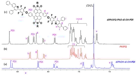 1H ΝΜR spectra in the zoomed region 7.0–9.0 ppm of (a) diPhOH-di-EH-PDI, (b) Ph5FQ and (c) diPh5FQ-PhO-di-EH-PDI in CDCl3.