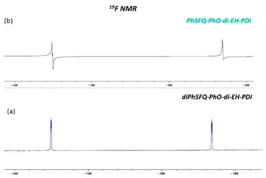 19F NMR was investigated in order to confirm the successful substitution of the fluorine at the para position. In Figure 5a,b, 19F NMR spectra of diPh5FQ-PhO-di-EH-PDI and Ph5FQ-PhO-di-EH-PDI are presented respectively, where the two types of fluorine’s could be observed and the peak owing to the fluorine at the para position was disappeared, confirming the successful nucleophilic substitution.