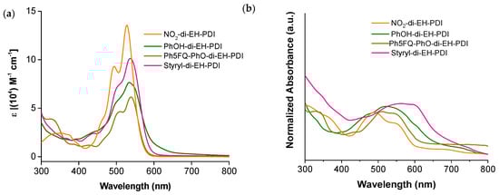 UV-Visible absorption of NO2—di-EH-PDI, PhOH-di-EH-PDI, Ph5FQ-PhO-di-EH-PDI and Styryl-di-EH-PDI (a) in o-DCB solutions (10−5 M) and (b) in film form.