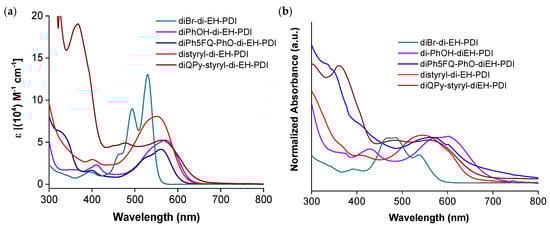 UV-Visible absorption of diBr-di-EH-PDI, diPhOH-di-EH-PDI, diPh5FQ-PhO-di-EH-PDI distyryl-di-EH-PDI and diQPy-styryl-di-EH-PDI (a) in o-DCB solutions (10−5 M) and (b) in film form.