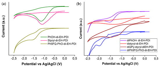 Reductive cyclic voltammograms spectra of (a) monosubstituted PDIs and (b) disubstituted PDIs.