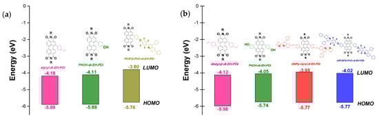 Energy levels of (a) monosubstituted PDIs and (b) disubstituted PDIs.