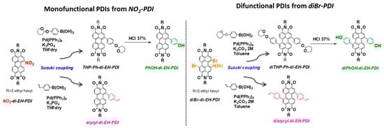 Bay-substituted PDIs could be synthesized reacting mono- or di-bromo derivatives of PDI under transition-metal-catalyzed C−C Suzuki coupling conditions [,,] However, there are several challenges. The bromination of the perylene skeleton under controlled conditions affords a 1,7- and 1,6-dibromo regioisomeric mixture, that is arduous to separate. Regarding the mono-bromo derivative of perylene diimide, can be achieved under mild conditions but in low yield and after a tedious purification process []. The synthetic routes providing the new monofunctional and difunctional PDIs are presented in Scheme 1. Firstly, the branched 2-ethylhexyl alkyl chains have been introduced to the starting commercially available material perylene tetracarboxylic dianhydride (PTCDA) through a condensation reaction, according to a literature reported procedure []. The final N,N′-Bis (2-ethylhexyl)-3,4,9,10-perylenetetracarboxylic diimide (di-EH-PDI) provide sufficiently soluble PDIs that could be used for the next step. For the difunctional PDIs, a bromination reaction was performed to have reactive groups in the bay area of the perylene skeleton. The two regioisomers arising from the bromination (1,6 and 1,7-di brominated PDI) could not been separated and used as a mixture according to literature (diBr-di-EH-PDI) []. The diBr-di-EH-PDI reacted through a Suzuki cross-coupling reaction with 4-styryl boronic acid group, providing two styryl groups attached at the bay area of perylene (distyryl-di-EH-PDI). Also, diBr-di-EH-PDI reacted with the same methodology with 4-(2-tetrahydropyranyloxy) phenylboronic acid [] to give the diTHP-Ph-di-EH-PDI derivative, which with treatment with HCl in tetrahydrofouran (THF) solution, resulted to the desired diPhOH-di-EH-PDI. Regarding the monofunctional derivatives, in order to avoid tedious process for the mono bromo PDI isolation [], selective addition of the nitro group to a single site of the perylene skeleton through controlled nitration conditions was utilized (at room temperature and in short time), enabling the isolation of the mono derivative in a multigram scale and in a very good yield (90%) without using column chromatography []. Mono nitro PDI derivative (NO2-di-EH-PDI) was used in palladium catalyzed Suzuki reaction, where the nitro group acts as the leaving group instead of another halogen. To the best of our knowledge mononitrated PDI has been used in Suzuki coupling reactions only one time before []. So, in order to investigate the advantage of the selective addition of the nitro group, we proceeded with the reaction of the nitro PDI with 4-styryl boronic acid and 4-(2-tetrahydropyranyloxy) phenylboronic acid in the presence of Pd(PPh3)4, potassium phosphate (K3PO4) and distilled tetrahydrofuran (THF dry) to synthesize styryl-di-EH-PDI and PhOH-di-EH-PDI (Scheme 1) in a fairly good yield (~80%). The final products presented good solubility in common organic solvents such as toluene, THF, dichloromethane (DCM), chloroform (CHCl3) and ortho-dichlorobenzene (o-DCB) and characterized through 1H NMR and 13C NMR spectroscopy (Figures S1, S2, S12 and S13).