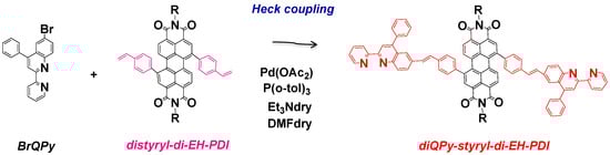 Due to the above problems, 6-bromo-(2-pyridinyl)-4-phenyl-quinoline (Br-QPy) was chosen to react with the distyryl-di-EH-PDI under the same Heck coupling conditions utilizing triethylamine as base and Pd (OAc)2 as the catalyst in DMF solution as shown in Scheme 2. Quinoline pyridine derivative consider to possess electron acceptor character and has been used previously in donor–acceptor copolymers for non-covalent interactions with fullerene species []. Herein, was used for the synthesis of non-planar, PDI structures affording molecules with low lying LUMOs, increased conjugation and good solubility.